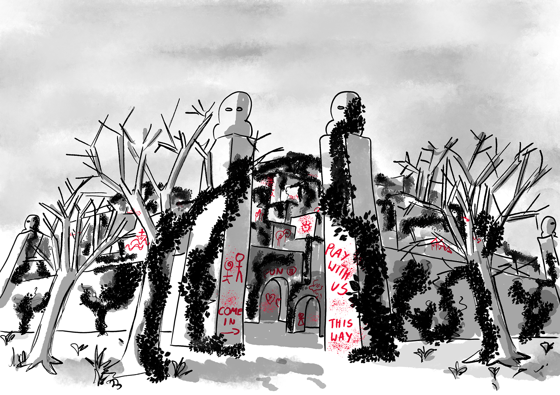 The drawings below present the initial concepts I came up with, depicting the key areas of the level. The centre is a huge space with a dead tree with a hangman knot on it, a fallen tree, and smoke coming out of the well - visible from far away, indicating the centre to the player. The entrance to the maze is framed with two busts of the Evil Lady on the huge pillars, dominating over the player. There would be some trees next to the entrance. I plan to let the player climb on the one of the pillars, so he could see the level from the top perspective also.